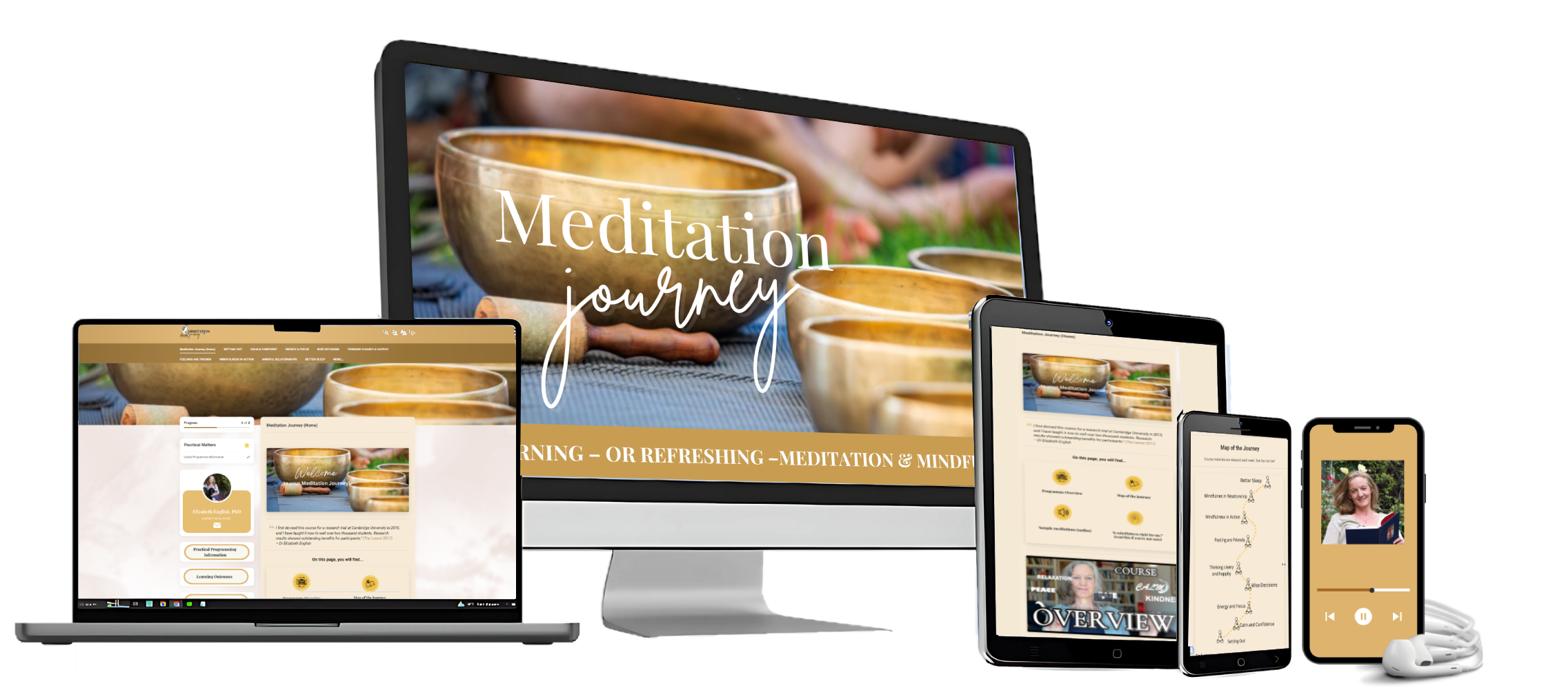 The Meditation Journey Online Course gives life-time access to a rich array of original resources, brimming with fresh ideas and insights. They were developed and taught by Elizabeth in the researched Mindfulness Programme at Cambridge University, with outstanding results (The Lancet, 2017).